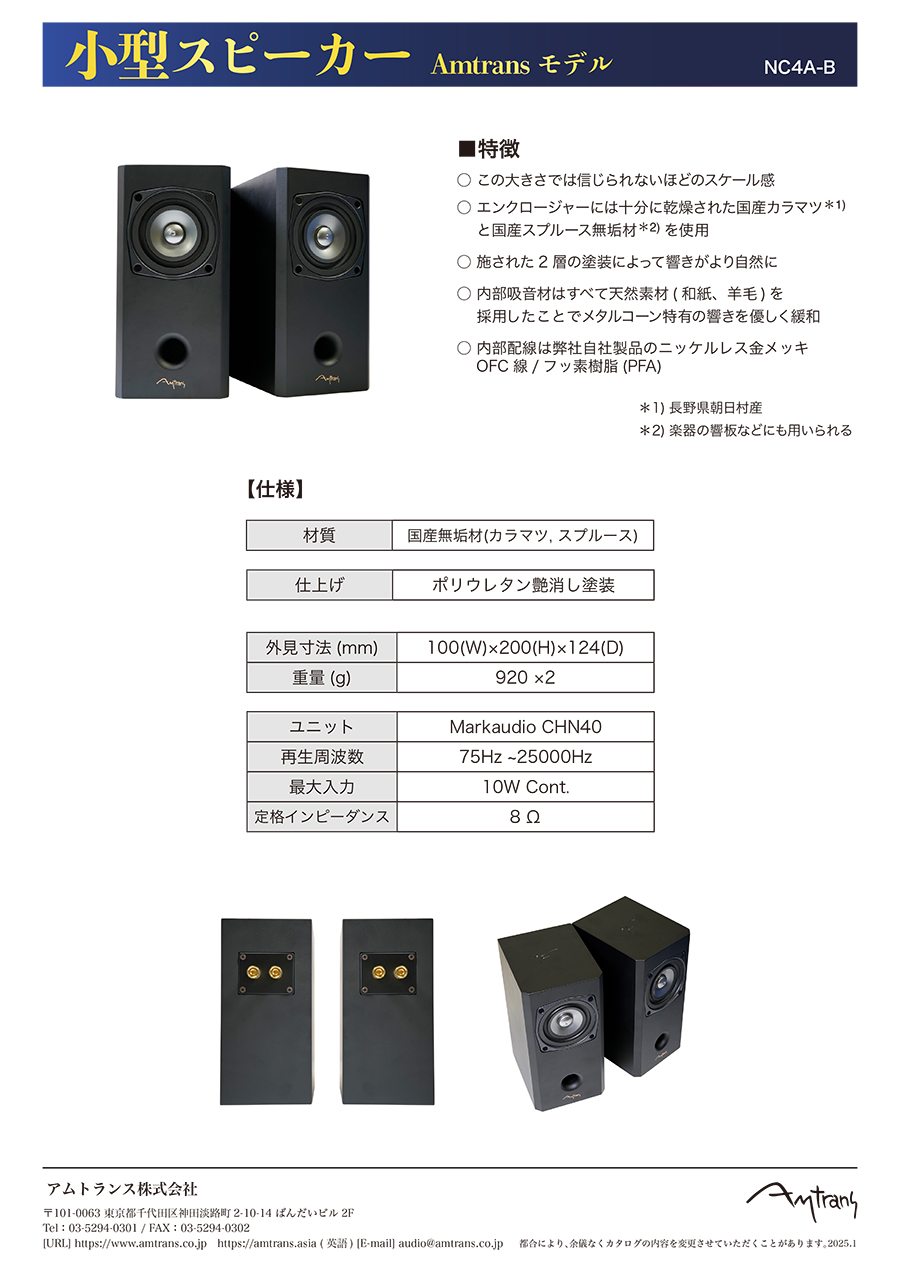 小型スピーカー Amtransモデル ◯ この大きさでは信じられないほどのスケール感 ◯ エンクロージャーには十分に乾燥された国産カラマツ(1* と国産スプルース無垢材(2* を使用 ◯ 施された2層の塗装によって響きがより自然に ◯ 内部吸音材はすべて天然素材(羊毛、和紙)を採用したことでメタルコーン特有の響きを優しく緩和 ◯ 内部配線は弊社自社製品のニッケルレス金メッキ ◯ OFC線/フッ素樹脂(PFA) (1* 長野県朝日村産 (2* 楽器の響板などにも用いられる